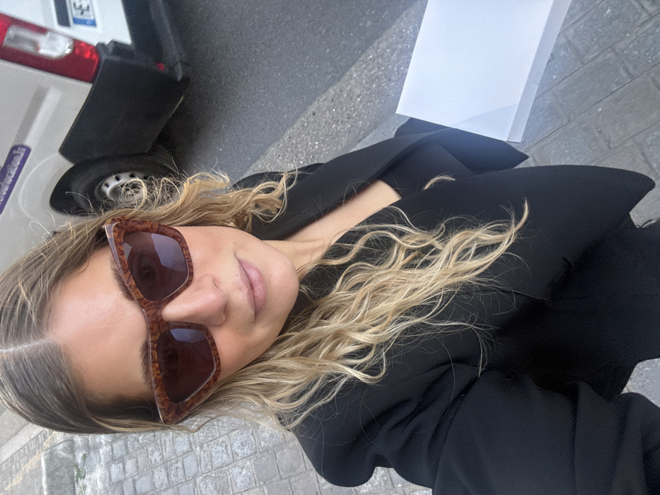 A female subject is depicted from a high-angle selfie perspective on a street in Nanterre, France. She has long, wavy, blonde hair parted down the middle and wears tortoise-shell, cat-eye sunglasses with dark lenses. She is dressed in a black blazer over a black top. In her right hand, she holds a white, unbranded rectangular box, partially visible in the lower right foreground. The subject stands on a grey cobblestone sidewalk. Behind her, a white commercial van is parked on the asphalt street. The van displays a partial URL ending in "location.fr" on its side and a partial French license plate ending in "HE 9" on its rear.