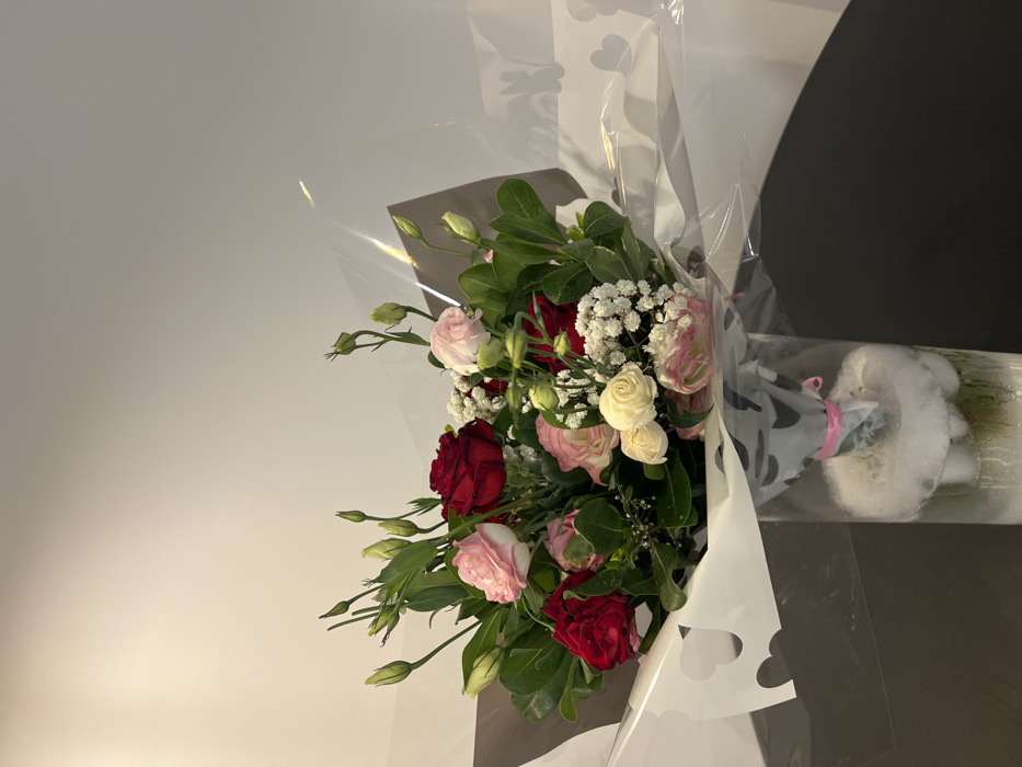 - "The image displays a floral bouquet housed in a clear cylindrical glass vase, placed on a dark, reflective surface, against an off-white wall" by FM-0vSl53, licensed under CC BY 4.0