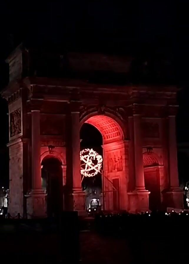 At night, a large stone archway is illuminated in red light. Inside the archway, a sphere of lights is visible. Silhouettes of people are visible in the foreground. The archway has a classical design with columns and decorative carvings. The sky is dark.