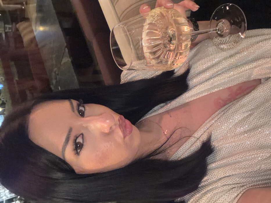 A woman with black hair, brown eyes, and a pink cross necklace holds a glass of white wine. She wears a sparkly silver shirt or dress. Her left arm has a red mark. The image is taken at an angle, with the woman's face and upper body visible. A blurry background suggests an indoor setting.