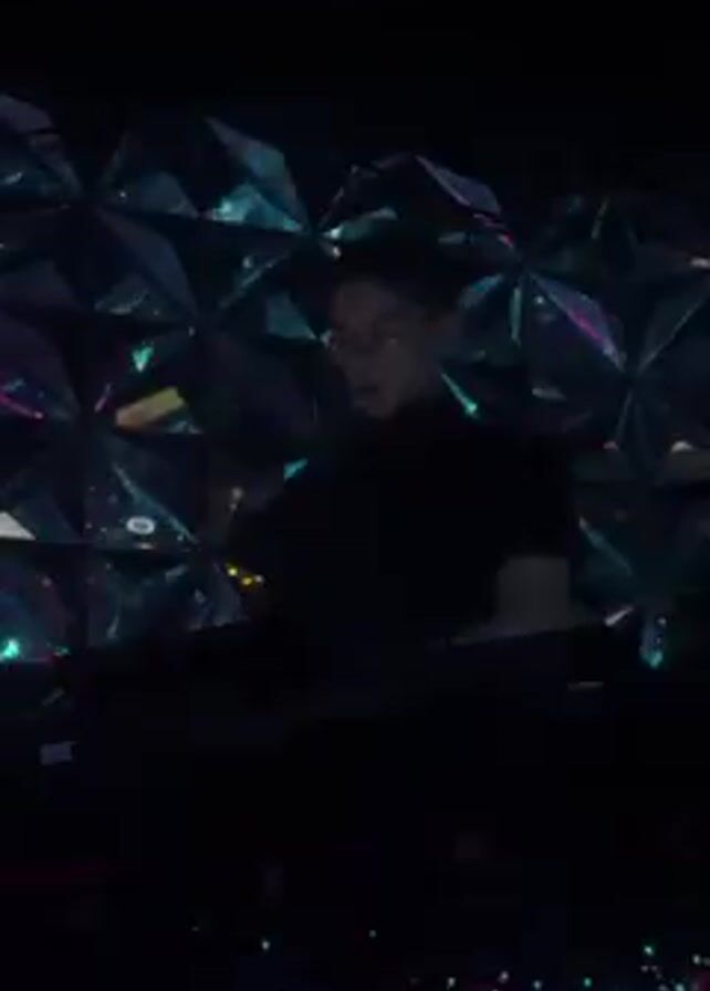 A man in a black shirt stands behind a DJ setup. He is in focus, and his hands appear to be manipulating the equipment. Behind him is a wall made of geometric shapes that reflect light, creating a prism effect. The overall lighting is dim, with blue and white lights flashing. There is audio of techno music playing.