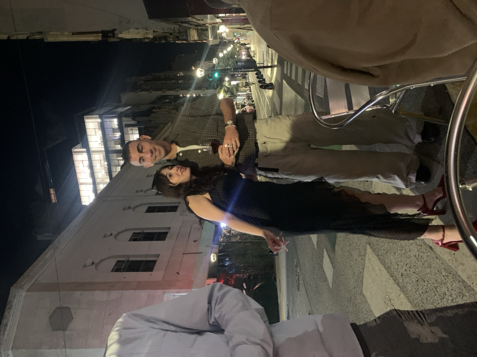A couple poses outdoors at night. The man wears a plaid shirt and tan pants, holding a drink. The woman dons a black dress and red heels. They stand on a textured sidewalk, with buildings and streetlights visible in the background. Part of a table and chairs frame the scene. Other individuals are present in the foreground and the background, partly obscured.