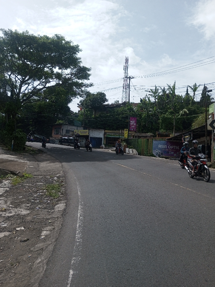 A street scene depicts a curved asphalt road with multiple motorbikes in motion. The road is flanked by a worn-out sidewalk on the left, while shops and businesses line the background, including "ASIA OPTIK." A towering cell tower punctuates the sky above the greenery. The sky is overcast with a scattering of clouds. Trees and vegetation fill the left side of the frame.