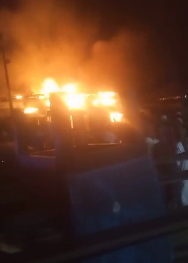 At night, flames engulf a building, emitting smoke into the dark sky. The fire appears intense and widespread across the structure. Silhouetted figures stand in the foreground, possibly observing the scene. The perspective is from behind a large, dark-colored object, obscuring the view. Overhead electrical lines are visible.