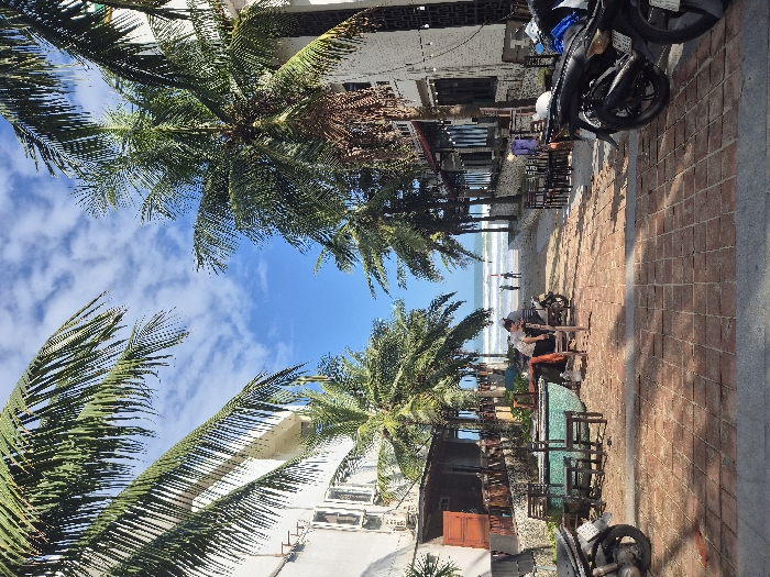 Palm trees frame a view of a beach and ocean under a partly cloudy blue sky. Two people are sitting on a bench near a beachside establishment with tables and chairs. A motorcycle is parked on a brick-paved sidewalk. Buildings line one side of the walkway, and the beach extends to the horizon.