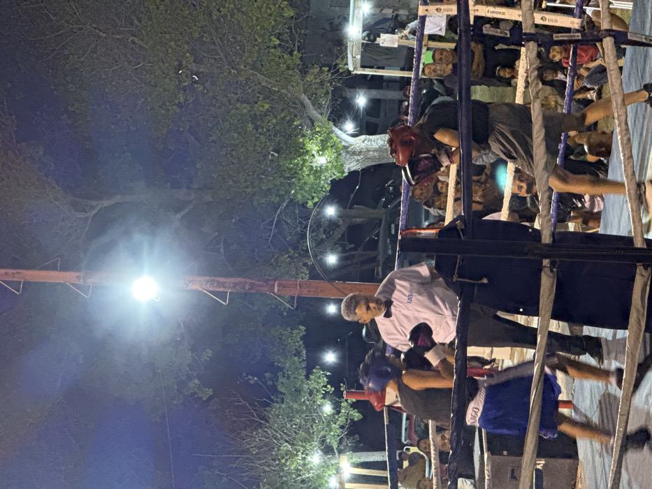 A boxing match unfolds in an outdoor ring at night. Two boxers wearing headgear and gloves are engaged in combat, watched by a referee in a white shirt. A crowd surrounds the ring, illuminated by string lights and a bright overhead light. Trees frame the scene, contributing to the night-time ambiance. The image captures the intensity of the boxing event and the surrounding spectators.