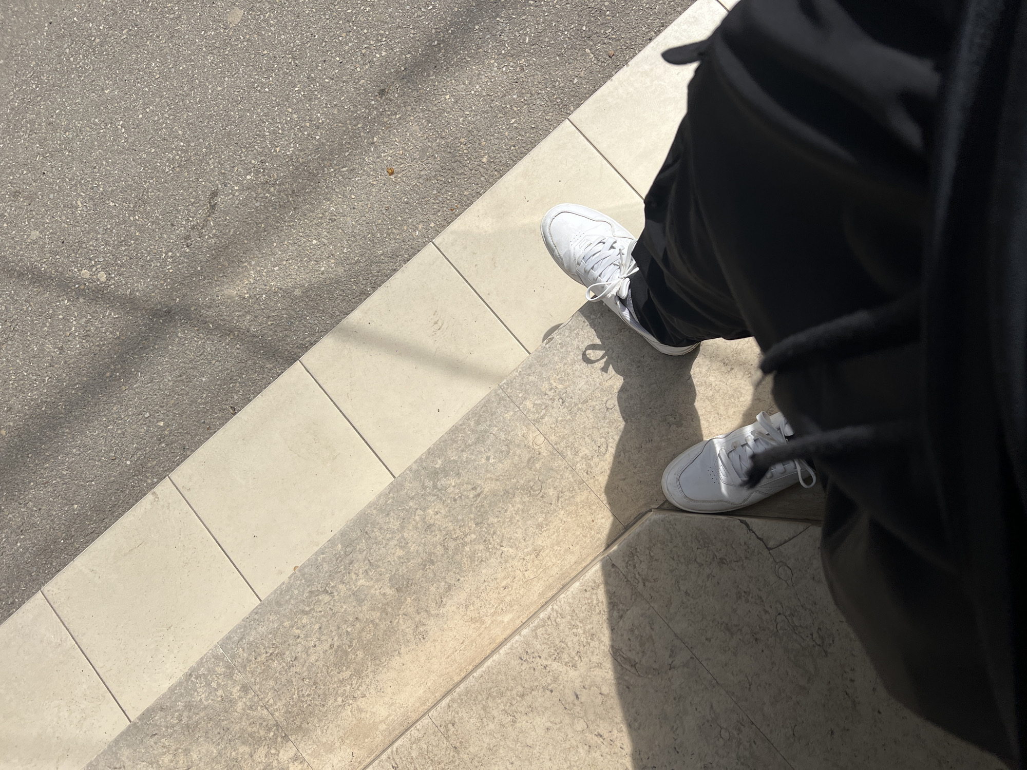 A person wearing white sneakers and black clothing is standing on a tiled walkway adjacent to an asphalt surface