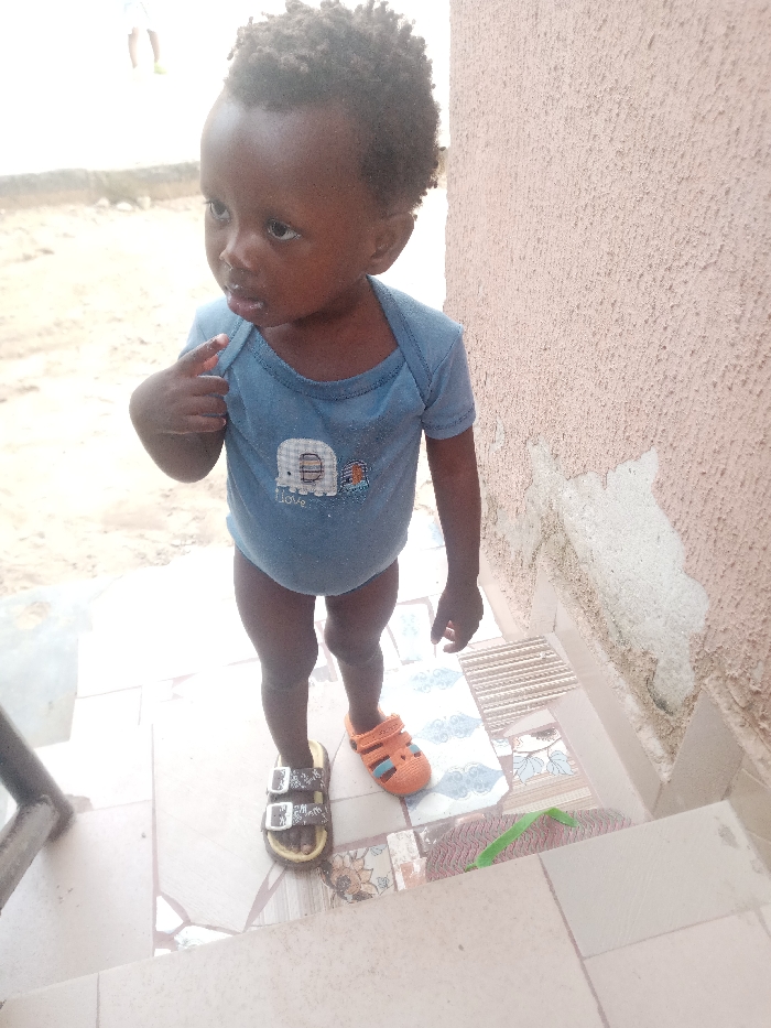 A toddler stands on tiled steps next to a textured wall. He wears a light blue onesie with a small elephant design and mismatched sandals: one brown with a buckle, the other orange with Velcro. The child looks to the left, his finger slightly raised. The background shows a blurry outdoor scene, with a metal bar visible on the left side of the frame.