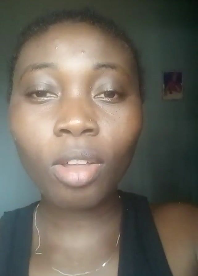 A young Black woman with dark hair is centered in a close-up shot. She wears a black tank top and a thin gold necklace. Her face is moist. She is speaking and moving her lips. Behind her is a teal wall with a small, indistinct image hanging on it.