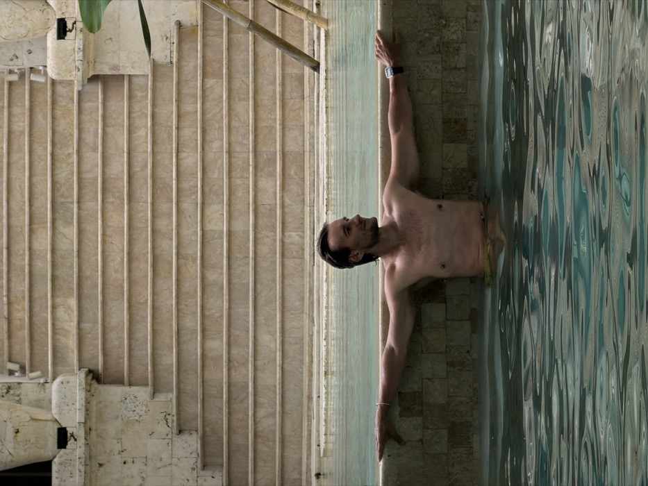 A man stands in water, his right arm extended upward along the pool's edge, adorned with a watch. His left arm stretches downward, fingertips grazing the pool's bottom. He faces left, gazing at a series of tan stairs that ascend. The water ripples, creating patterns of blue and gray. The scene is serene, capturing a moment of relaxation in a well-designed space.