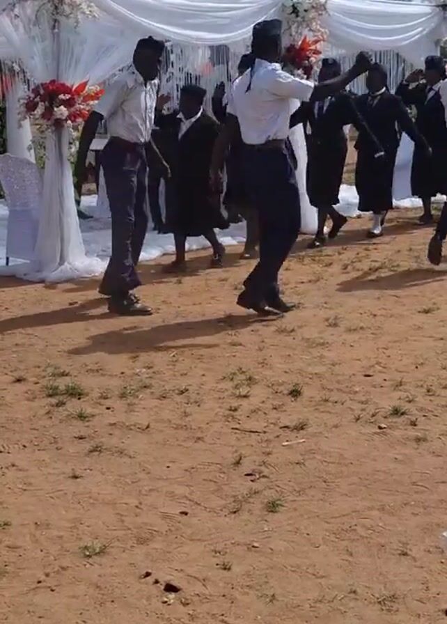 group of people dressed in black suits or outfits, some with white shirts, walking and dancing in front of a wedding-like white draped structure with floral arrangements. There are men wearing hats among the group. The setting appears to be an outdoor area with a dirt ground. Later, a man wearing a white t-shirt, orange safety vest, sunglasses, and a hat, steps into the foreground and slightly obstructs the view.