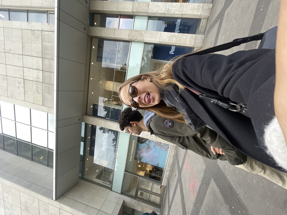 The image captures two individuals on a sidewalk in front of the Peek & Cloppenburg department store at Westenhellweg 104-106, Dortmund, Germany, during daylight hours. In the immediate foreground, a female, identified by long, light brown hair, dark oval sunglasses, a dark long coat, and a gray patterned scarf (displaying discernible "Gucci" branding), faces the camera with her mouth open and tongue extended in a casual gesture. Her right hand, partially visible at the bottom right corner, covered by a white fuzzy material, suggests she is holding the camera for a self-portrait. Slightly behind and to the left of the female, a male with dark curly hair and glasses is positioned, wearing a dark green field jacket with a circular patch on the left sleeve and light-colored trousers; he is looking towards the right side of the frame, away from the camera. The background consists of the multi-story modern building facade, featuring light-colored stone panels and extensive glass windows displaying the "Peek & Cloppenburg" and "Peek. Cloppenburg" store names. The paved sidewalk in the lower left foreground shows minor red markings.