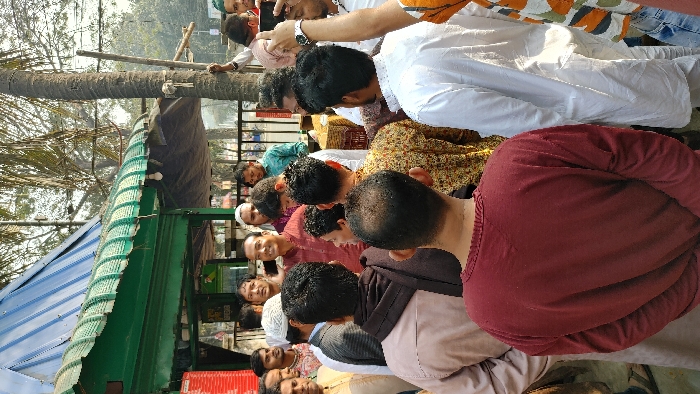 The image displays an outdoor urban scene in Dhaka, Bangladesh, populated by a group of approximately 15-20 adult males