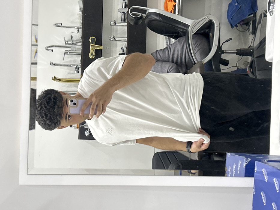 A male individual is captured in a mirror selfie within what appears to be a plumbing supply showroom or store in Al-Yarmuk, Syria. The individual, positioned centrally, has dark, curly hair and wears a white t-shirt with a Kappa logo on the left chest, and black pants. A black watch is present on his left wrist. He holds a light purple smartphone in his right hand, obscuring the upper portion of his face, with his right eye visible. His left hand is grasping the bottom hem of his t-shirt. The background, reflected in the mirror, consists of a white wall and a dark-colored display shelf exhibiting an assortment of plumbing faucets in chrome and gold finishes. In the lower left foreground, several blue boxes branded "GROHE" are stacked. To the right, another individual is partially visible, reclining in a black and silver office chair, wearing grey attire. A blue fabric object rests on the floor near the chair, and an orange fabric is visible on a shelf behind it.