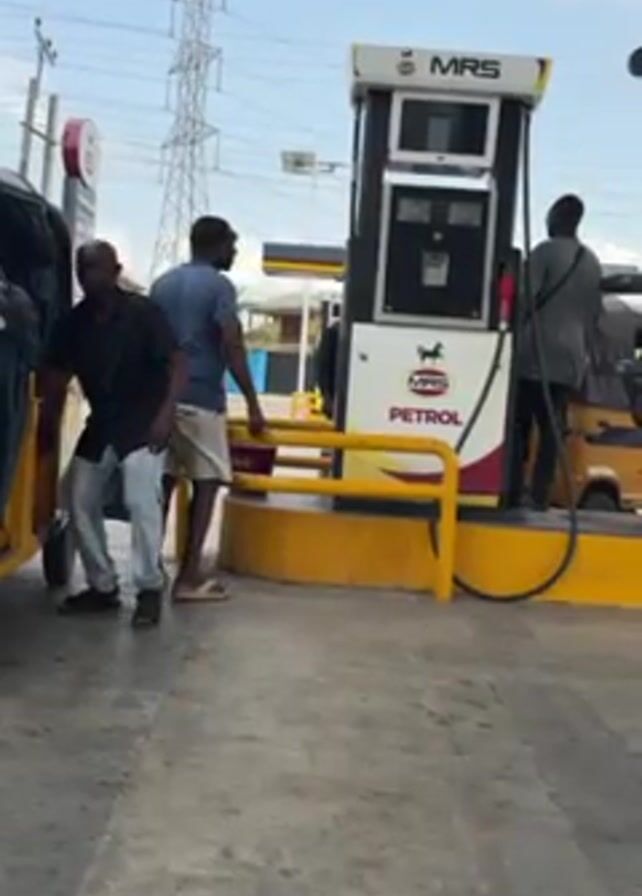 petrol station in Nigeria. Three men, one wearing a black shirt and light jeans, another in a blue shirt and khaki shorts, and the third in a gray outfit, are filling green jerrycans with gasoline. They retrieve the filled cans from a yellow three-wheeled vehicle, identified as a TVS, which is positioned at the MRS petrol pump. Power lines and buildings are visible in the background under a partly cloudy sky.