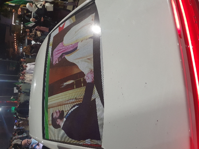 A white vehicle, possibly a car, is shown. The side of the vehicle displays a screen showing two figures, one in traditional Saudi attire with a red and white headdress, and another man in a dark suit. In the background, a crowd of people is gathered, some holding green flags. The scene appears to be at night or dusk, with artificial lighting present. The red tail light of the vehicle is also visible.