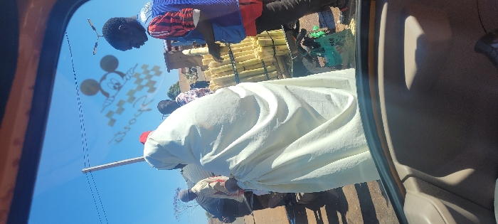 The image captures a street scene in Bukuru, Nigeria, viewed from inside a vehicle. The exterior view displays a clear blue sky. A prominent figure in the center wears a full white flowing garment, facing away from the viewer, carrying an infant secured on their back. To the right, a dark-skinned male, wearing a blue vest over a red and white striped long-sleeve shirt and dark trousers, stands next to a vendor's cart. This cart is loaded with numerous bundles of light-colored, peeled sugarcane stalks, arranged vertically. A green plastic bag is visible on the ground near the cart. In the background, an unpaved surface suggests a dirt road or shoulder. Other individuals are partially visible: one in a light shirt to the left of the white-garmented figure, and another with a red cap further back. Utility poles and lines are present against the sky. Distant, indistinct structures and sparse vegetation, including a tree with purple blossoms, complete the background. Reflections of a Mickey Mouse cartoon and inverted text are visible on the vehicle's window. The vehicle's beige interior trim is visible at the bottom.