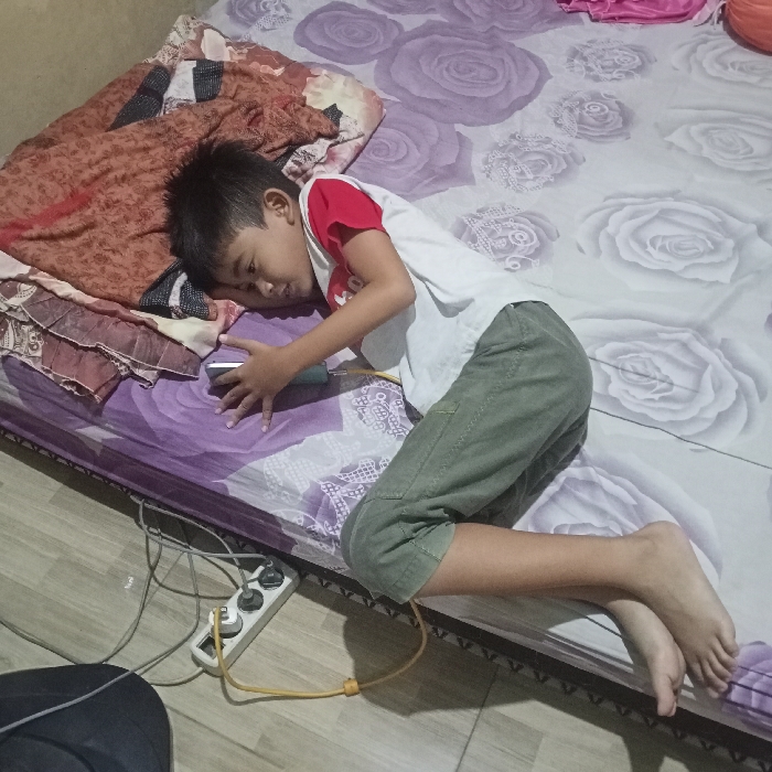 A young individual, identified as a child, is observed lying prone on a bed in an indoor setting within Ketowan, Indonesia. The child is positioned with their head resting on their left arm, facing right, and appears to be engaged with a white smartphone held in both hands. The child wears a white short-sleeved shirt with red trim and olive-green shorts; their feet are bare. The bed features a mattress covered by a purple sheet with a white rose pattern. A multi-colored, predominantly brown and orange, patterned blanket or fabric item is folded and stacked at the head of the bed. A yellow charging cable extends from the smartphone to a white power strip, which rests on the floor beside the bed. Multiple grey electrical cables are also connected to this power strip. The floor surface appears light in color.