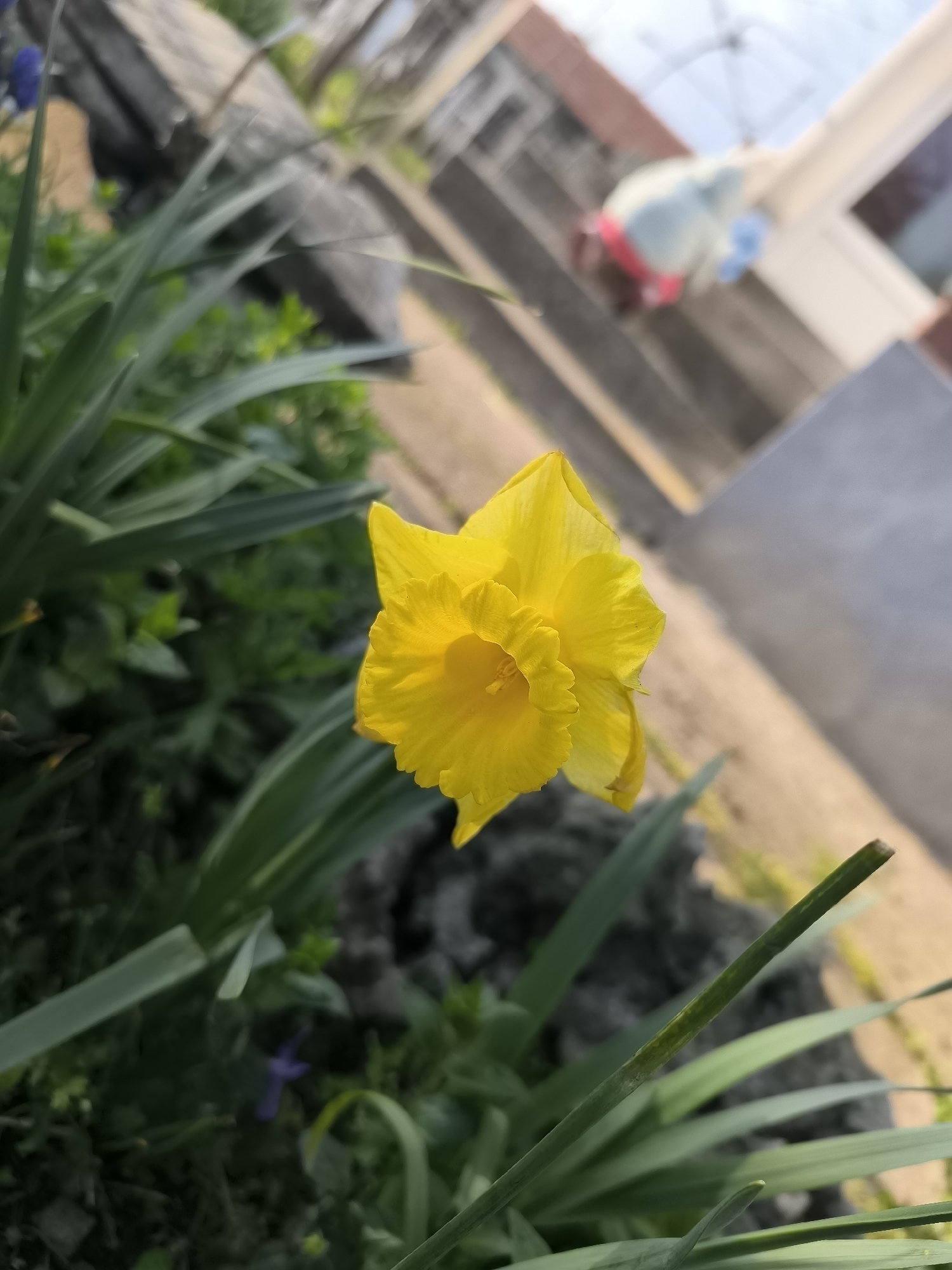 A close-up, slightly angled shot shows a yellow daffodil in bloom. The flower's petals are bright yellow and exhibit ruffled edges. It's surrounded by long, green, blade-like leaves and other smaller green plants. In the blurred background, a light-colored stone wall or pathway is visible, along with a building or structure painted with light colors. The image doesn't contain sufficient information to determine the exact location within the city of Gulyantsi, Bulgaria. No people, subjects, actions, or interactions are visible.