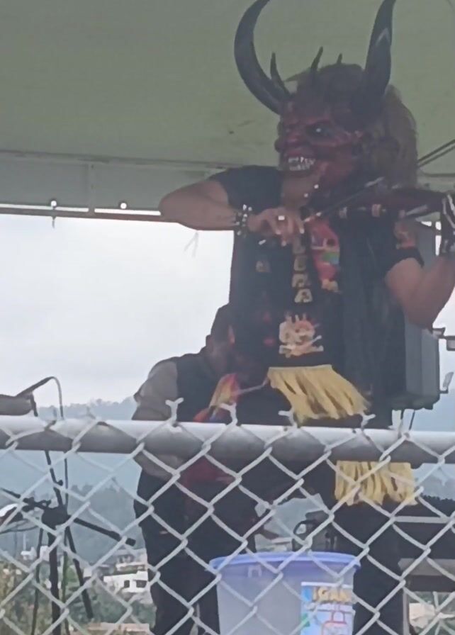 A man with a demonic mask and large horns plays the violin on a stage. He is wearing a black t-shirt with a colorful graphic on it, black pants, and gloves with skeletal hand designs. A black vest is draped over his shoulders. He is standing behind a chain-link fence with a plastic bucket filled with white confetti in front of it. A speaker is placed on the right side of the stage. Another man is visible in the background to the left of the masked man. The surrounding environment includes a grassy area and what appears to be a residential neighborhood in the distance.