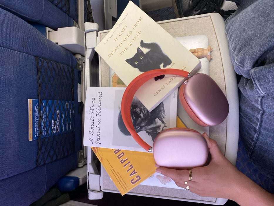 The scene depicts a passenger's perspective inside an airplane cabin. The specific location in Oceanside, United States, cannot be determined from the image, as the environment is an airplane interior. In the foreground, a light-colored, deployed airplane tray table is visible. Resting on the tray table are three books and a pair of headphones. The books include an orange-covered book partially showing "CALIFORNIA," a white-covered book titled "A Small Place" by Jamaica Kincaid featuring a black and white image of a man in sunglasses, and a cream-colored book titled "If Cats Disappeared from the World" by Genki Kawamura, displaying a black cat on its cover. A small, light-colored figure is partially visible beneath the "If Cats Disappeared from the World" book. A person's left hand, wearing two gold-colored rings on the ring finger, is holding a pair of rose gold/pink Apple AirPods Max headphones with an orange/coral fabric headband. The individual's lap, covered by blue denim jeans, is visible in the lower right portion of the frame. In the background, a blue fabric airplane seat with a black mesh seatback pocket is visible. The pocket contains various white and blue informational pamphlets, including safety instructions and a card with partially legible text such as "WE'RE ALL IN THIS TOGETHER" and "IF YOU SEE SOMETHING SUSPICIOUS OR UNUSUAL." The overall environment is consistent with a commercial airline passenger seat.