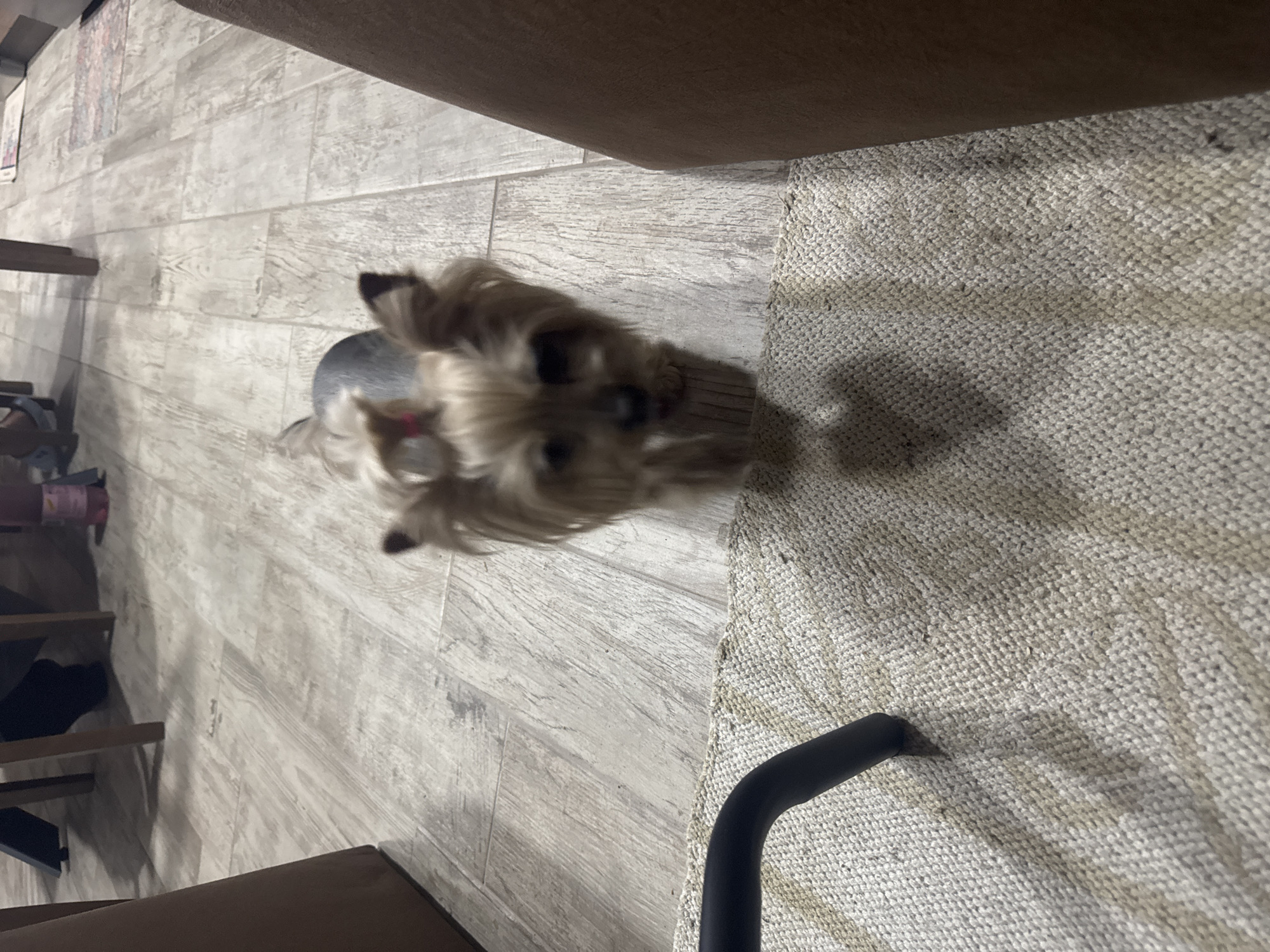 A Yorkshire Terrier dog stands on light-colored wood-look flooring adjacent to a light-colored carpet. A brown sofa is partially visible above the dog. Part of a black chair frame is also visible. The scene is indoors. The location cannot be determined from the image alone.