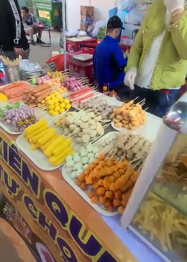 street food stall in an outdoor setting. A woman wearing a mask and gloves stands behind a counter displaying various skewers of food items. The skewers include sausages, colorful fish balls, corn, and other unidentified ingredients. A man in a blue shirt is working behind the counter, and another man is visible to the left of the frame. A refrigerated display case containing seafood and other items is also visible. The stall's banner is emblazoned with the words "XIEN TU". The environment appears to be a crowded marketplace or festival, with people walking around in the background.