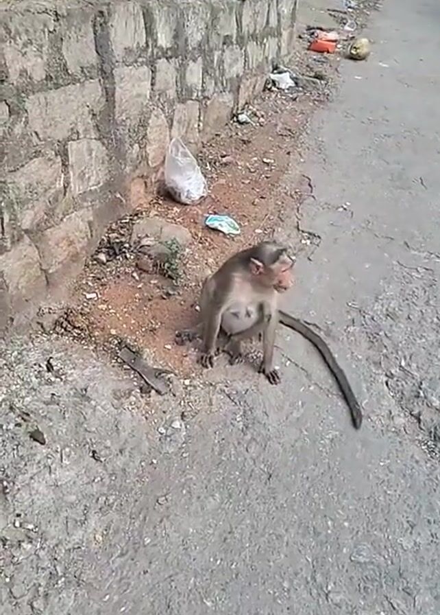 monkey sitting on the side of a road, next to a stone wall