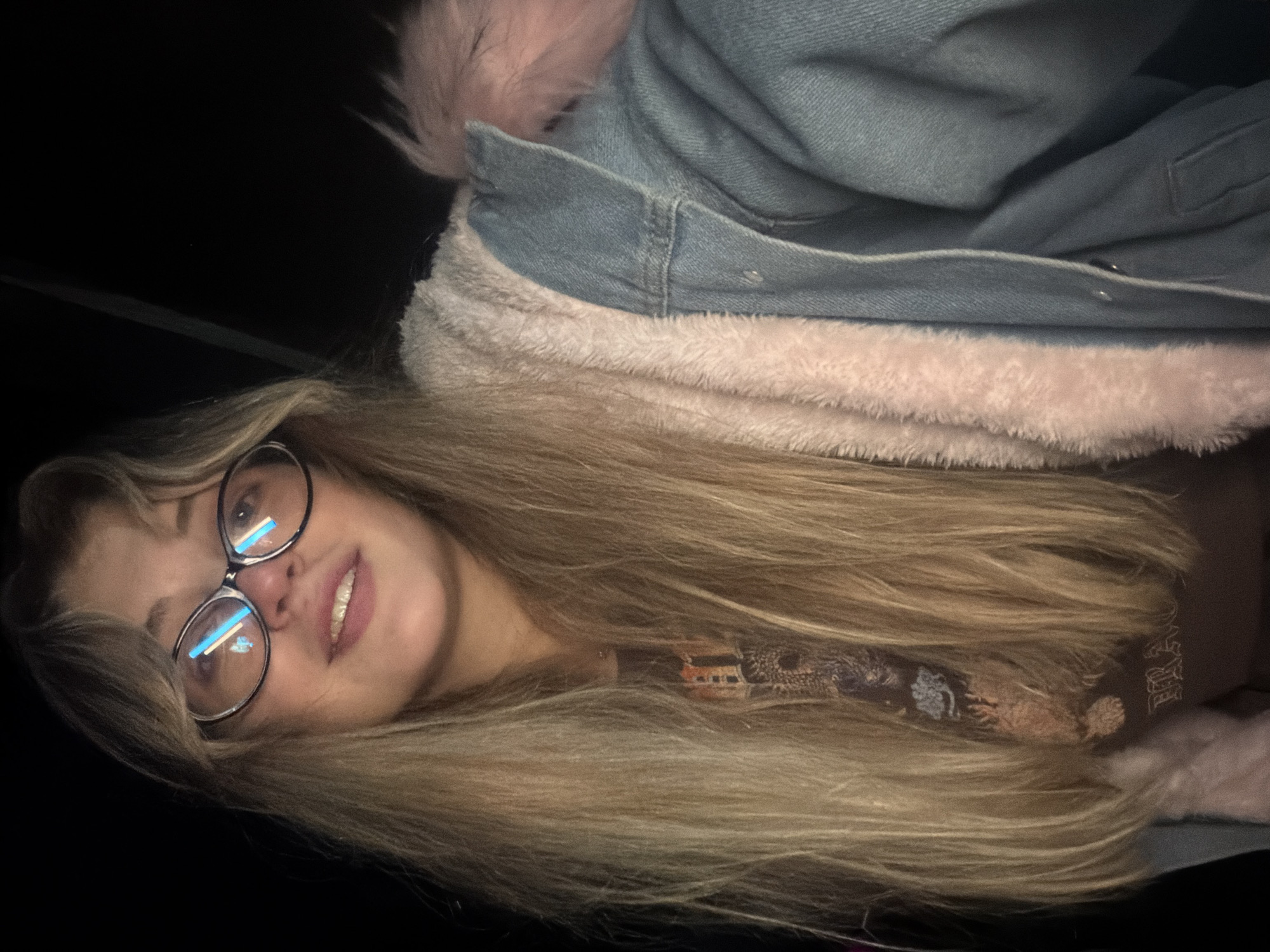 - "A woman with long blonde hair, wearing glasses, a patterned brown shirt, and a blue denim jacket with pink fur trim, is facing the camera" by FM-aKWvB3, licensed under CC BY 4.0
