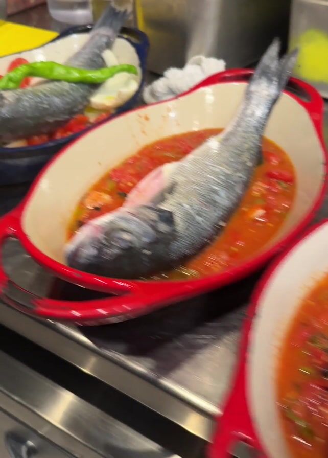 close-up view of several raw fish in separate oval-shaped dishes, sitting on a stainless steel countertop. The fish in the red-rimmed dishes are partially submerged in a red tomato-based sauce. The fish in the blue-rimmed dish rests on sliced tomatoes, onions, and a green chili pepper. The scene appears to be in a restaurant kitchen. There's a bottle of white wine and some metal containers visible in the background.
