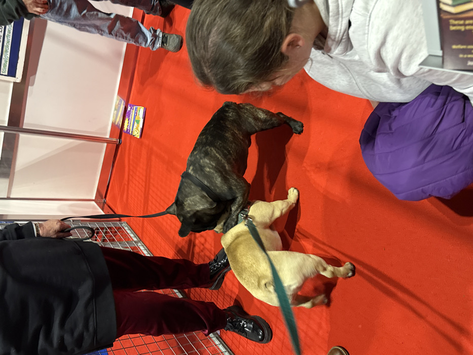 The image depicts an indoor scene at an exhibition or event, likely within the National Exhibition Centre (NEC) near Birmingham, United Kingdom. The floor is covered entirely by a bright red carpet. In the foreground and midground, two leashed French Bulldogs are interacting. The fawn-colored French Bulldog on the left wears a dark collar with a teal-colored leash attached, extending out of frame. The brindle-patterned French Bulldog on the right, dark brown/black with lighter streaks, wears a black harness connected to a black leash held by a person standing to the far left. The brindle dog has its head positioned near the fawn dog's neck/shoulder area. A person on the far left is visible from the waist down, wearing black trousers and shiny black lace-up boots, holding the black leash. A metal grid barrier is situated behind them. Another person is partially visible on the far right, from the knees down, wearing blue denim jeans and dark shoes. In the bottom right, a young individual, likely seated, is viewed from behind and the side. They are wearing a light grey hooded sweatshirt and hold a dark-covered book or leaflet. A purple puffer jacket rests beside them on the red carpet. The background consists of white exhibition wall panels supported by vertical metallic poles. A small, colorful, rectangular object lies on the red carpet in the midground-right. A white sign with partially visible blue text is affixed to the wall in the upper right. Shadows are cast on the carpet by subjects and overhead lighting.