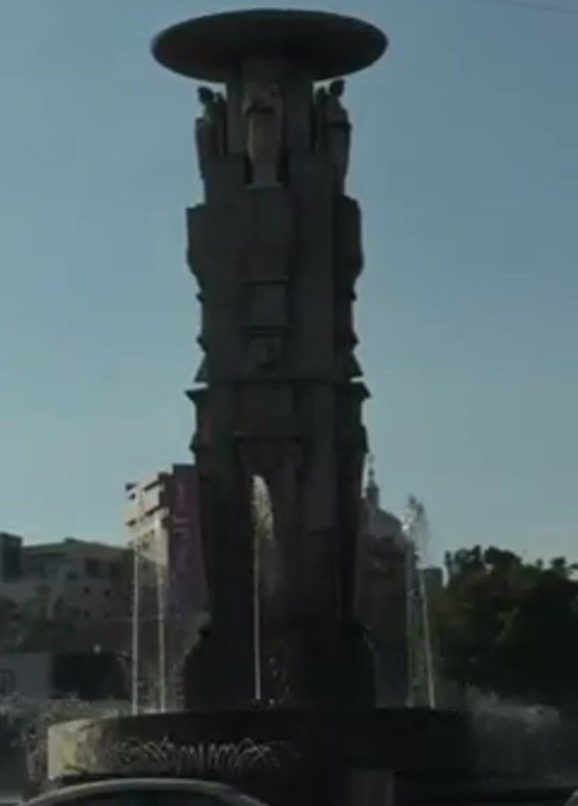 tall, dark stone fountain in the middle of a roundabout. The fountain has a circular top, with several figures standing around the rim. Water is jetting out from various points in the fountain's base, creating a spray. In the background, there are buildings, trees, and a clear blue sky. A car is visible on the road in the foreground.