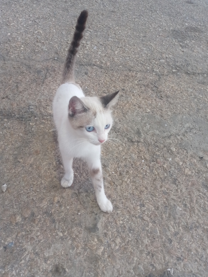 A white cat stands on a gray, rocky surface. The cat has light brown markings on its head, ears, tail, and one front leg. Its eyes are bright blue. The tail is raised straight up. The cat appears to be mid-stride, with one paw raised and the other three on the ground. The surface beneath is uneven.