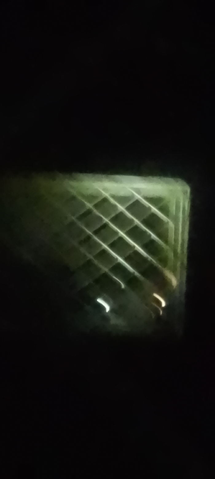In a dark setting, a blurry, illuminated structure is visible. It appears to have a grid-like pattern, possibly a lattice or waffle design, suggesting a building or architectural element. Faint light streaks at the bottom imply movement or light sources. The overall image quality is poor due to low light conditions and motion blur.