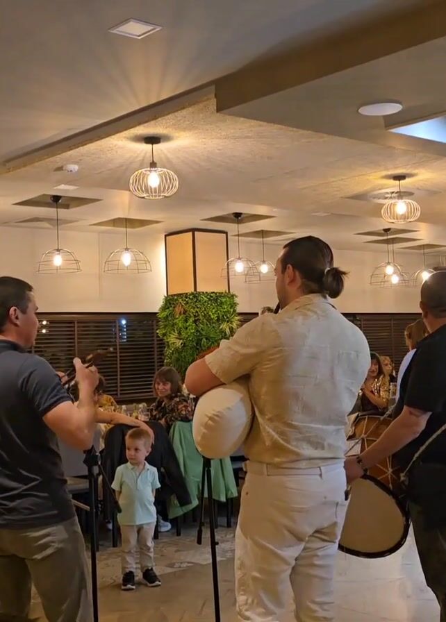 A live band of four musicians plays for a seated crowd in a restaurant. One musician plays an accordion, another an electric guitar, the third a gaida (bagpipe), and the fourth a drum. Most of the restaurant's patrons are seated at tables. A young boy stands between two musicians in the foreground, looking on. The restaurant is decorated with modern pendant lighting and artificial plants on the walls.
