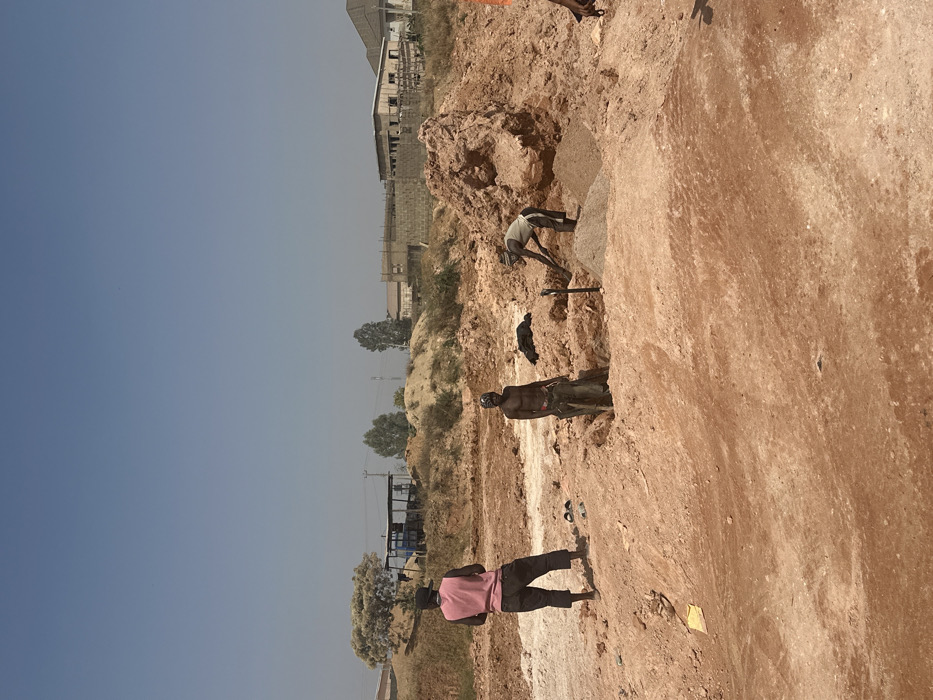 This image depicts an outdoor scene in Kwang, Nigeria, characterized by active manual labor under a clear, light blue sky