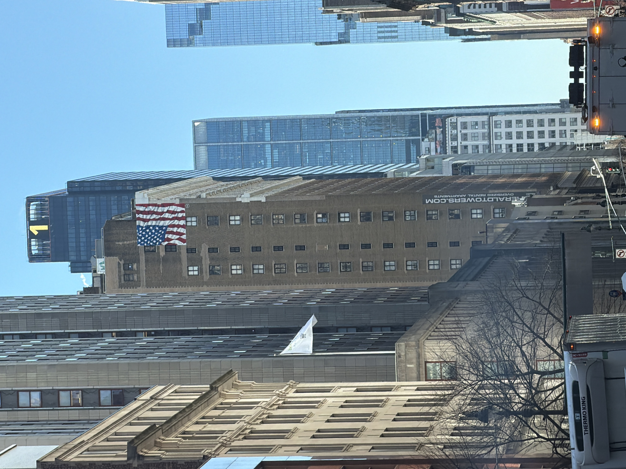 The image depicts a dense urban street scene in Midtown Manhattan, New York City, United States of America, likely looking east along a cross street such as 34th Street. The sky is clear blue overhead. Dominating the central midground is a tall, brown brick building, identified as "Herald Towers" by a large banner on its lower facade reading "HERALDTOWERS.COM OVERSIZED RENTAL APARTMENTS". A large American flag is draped vertically from an upper floor of this building. To its left, a white flag with green text, including "EMERALD TOWERS" and a smaller "NYC", flies from a flagpole atop a different, lighter-colored building. Further in the background, multiple modern glass-faced skyscrapers rise, with one notably tall dark building featuring a large yellow "1" on its peak, consistent with One Vanderbilt. Other buildings of varying architectural styles and heights line both sides of the visible street canyon. In the immediate foreground, the upper sections of two large commercial vehicles are visible: a white truck with a "THERMO KING" refrigeration unit on the left, and a gray truck with amber lights on its roof on the right. Between these vehicles and the buildings, a leafless tree stands, indicating a colder season. The scene is illuminated by bright sunlight, casting some shadows. No individuals are clearly visible.