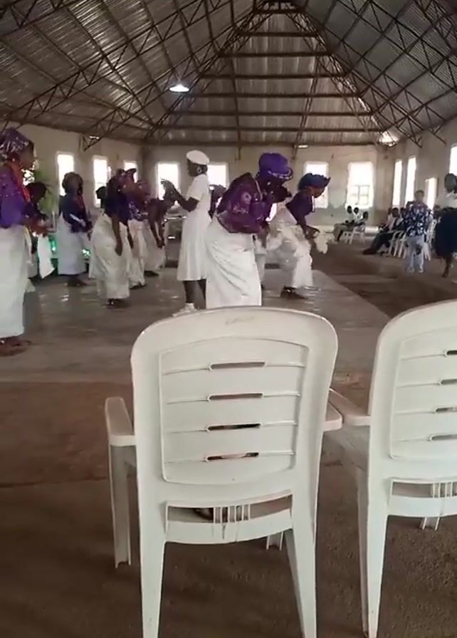 Inside a large, high-ceilinged room with an open metal framework roof, a group of about a dozen women are dancing. The women are wearing predominantly white outfits with accents of purple and patterned headwear. They perform synchronized movements, bending, swaying, and raising their arms. In the background, some people are seated, observing the performance. In the foreground, there are two white plastic chairs. The floor is a plain concrete surface. Windows line the sides of the room, providing natural light.