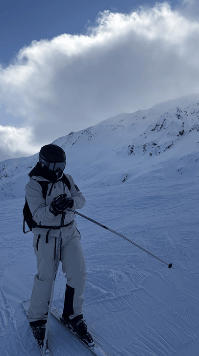 A sole individual is depicted standing on a snow-covered mountain slope, positioned on two skis with black bindings and boots