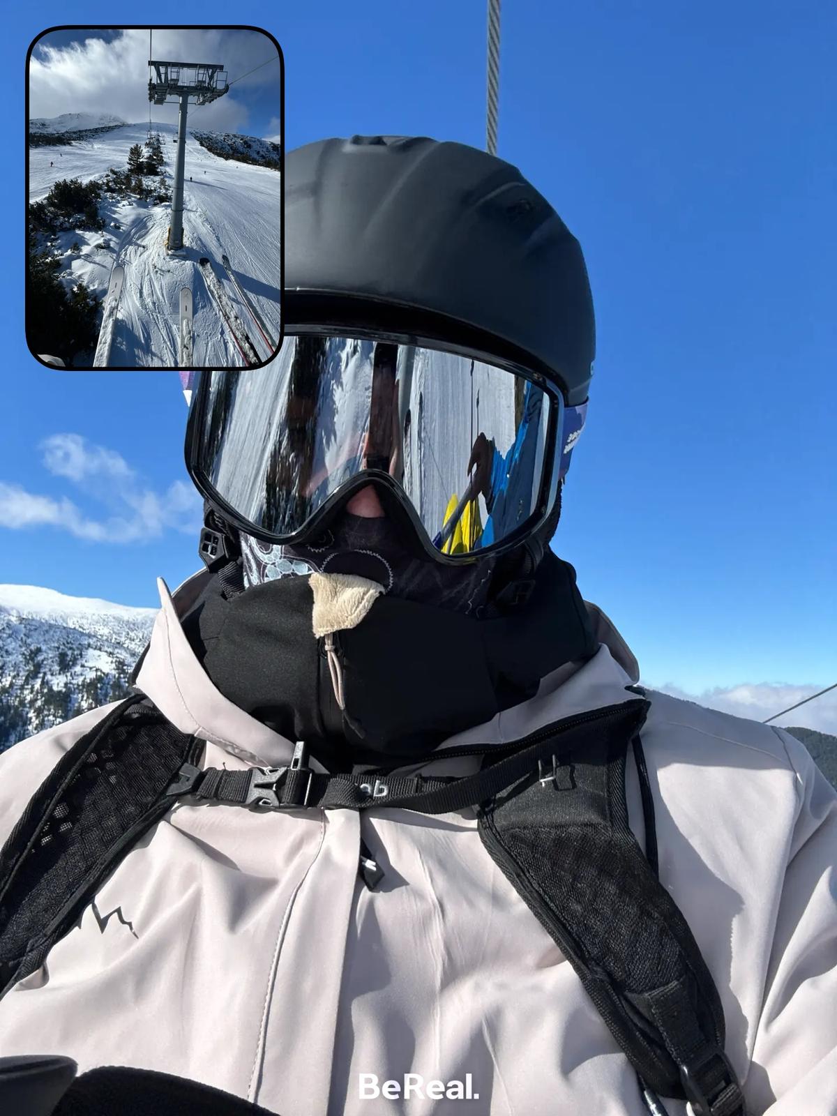A close-up, chest-level portrait depicts an individual in ski gear, captured from a ski lift at a ski resort in the mountainous area near Velingrad, Bulgaria