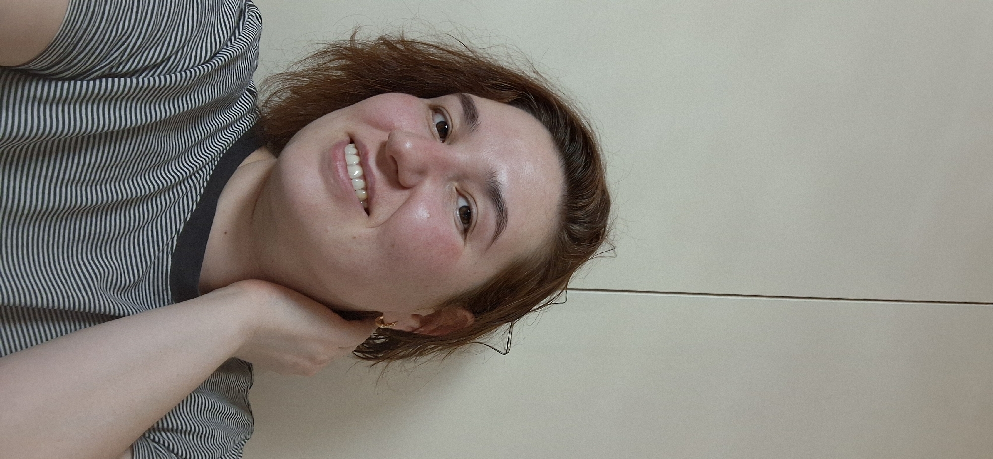 A young woman with fair skin and reddish-brown hair is smiling at the camera. She is wearing a striped shirt. Her left hand is touching her chin. The background is a plain, light-colored wall with a horizontal seam. There is no discernible indication of Chaikovsky, Russia.