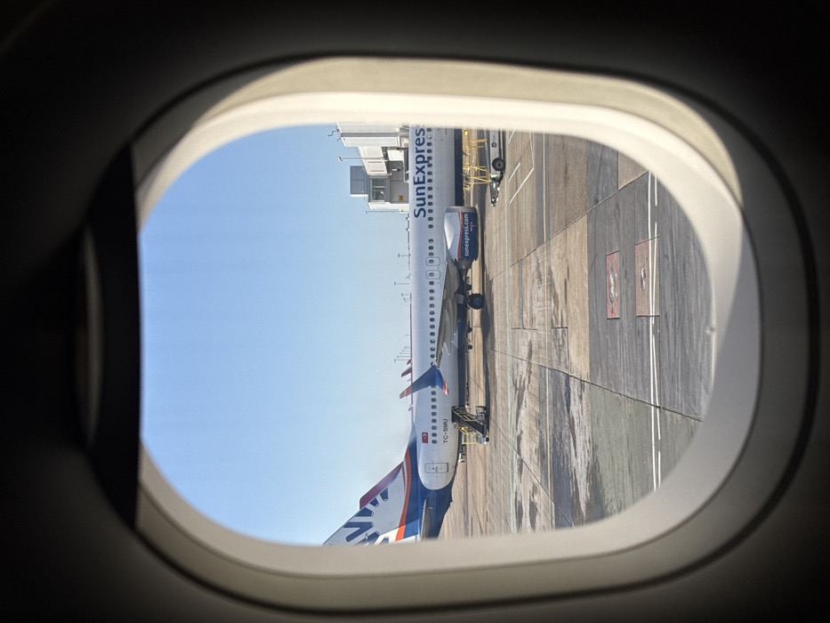 - "The image depicts an exterior view from an aircraft window overlooking an airport apron under a clear blue sky" by FM-WgO0P2, licensed under CC BY 4.0