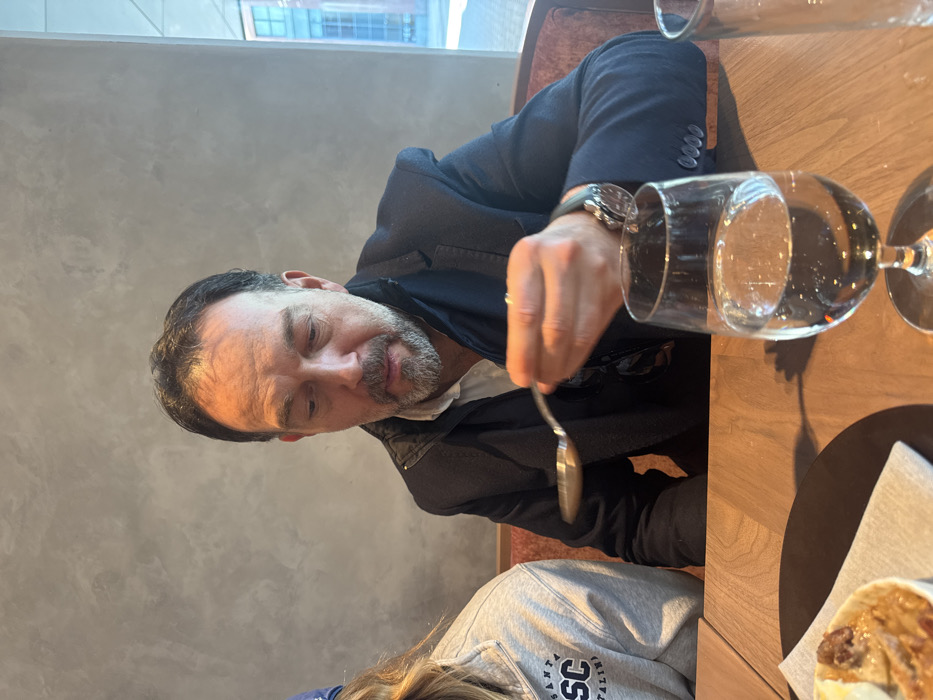 A man in a blazer and watch is captured in a well-lit, rotated image. He holds a spoon. A wine glass is prominent on the table next to him. A portion of another person wearing a gray sweatshirt is visible at the bottom. A plate of food sits on the right. The background features a textured wall and a glimpse of a building through a window. The scene is at a restaurant.