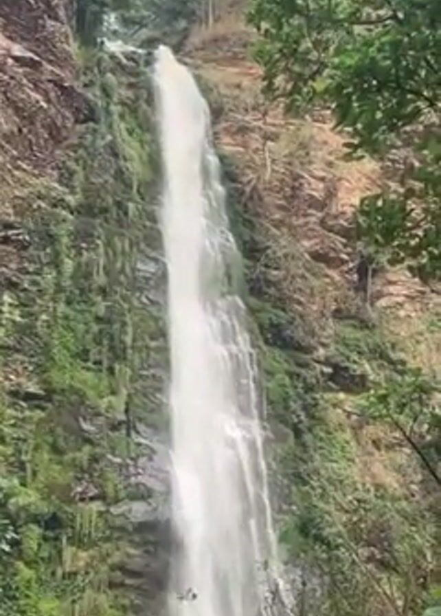 tall waterfall in a lush, green environment. The waterfall cascades down a rocky cliff face covered in moss and vegetation. Trees with green leaves are visible in the foreground, partially obscuring the view of the falls. The water appears white and foamy as it plunges downward. The surrounding terrain is rocky and covered in a mix of trees and plants. The sky above is overcast.