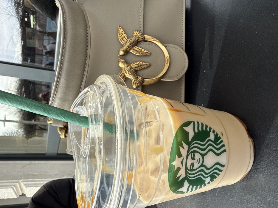 - "The image presents a close-up, slightly elevated view of a Starbucks iced beverage and a handbag positioned on a dark, flat surface, likely a table" by FM-Guwq73, licensed under CC BY 4.0