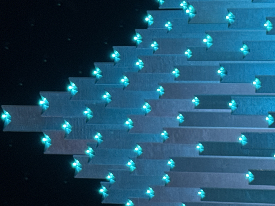 The image displays a close-up, static shot of a large-scale illuminated installation against a dark background, indicating a nighttime setting in Ho Chi Minh City, Vietnam. The installation comprises numerous vertical, rectangular columns of varying heights, arranged in a dense, staggered pattern across the frame. Each column is topped with a small, stylized, cup-shaped or petal-shaped fixture containing a single bright aqua-blue light source, consistent with an LED. These lights emit a soft blue glow, illuminating the upper sections of the grey-toned columns. The dark background shows sparse, faint, out-of-focus light points. No individuals are visible. This type of decorative light display, often featuring stylized lotus lanterns (hoa đăng), is characteristic of cultural or religious festivals, such as Vesak (Buddha's Birthday), and is commonly seen in public spaces, pagodas, or along main thoroughfares throughout Ho Chi Minh City. The exact street or specific pagoda location within the city cannot be precisely determined from this cropped view.