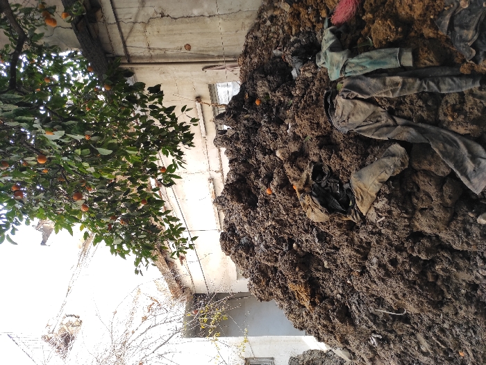 - "The image depicts a large, irregular mound of dark brown, clumpy soil or mud occupying the foreground and midground of an outdoor urban space in Al-Qanawat Municipality, Syria" by FM-oaYm93, licensed under CC BY 4.0