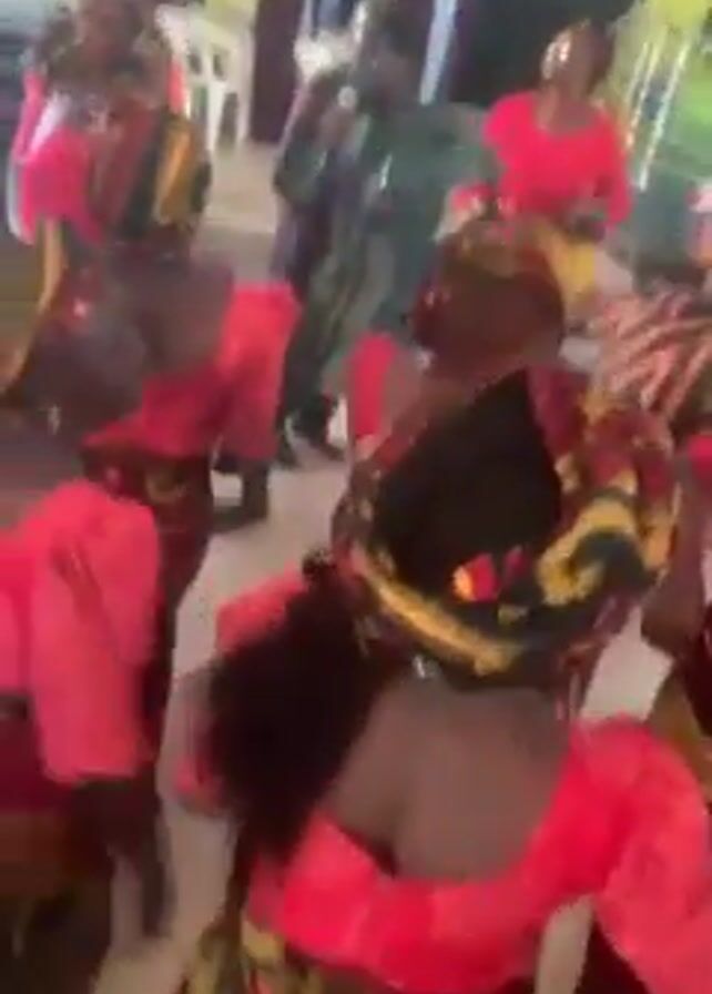 The scene features a group of individuals, mostly women, in a brightly lit indoor space. The women are dressed in matching red lace tops and patterned skirts. They are wearing elaborate head wraps, primarily in yellow and brown tones. A man in a patterned green suit and dark shoes is visible in the center of the group, holding a microphone and appearing to be singing or speaking to the crowd. He is surrounded by the women, who seem to be enjoying his performance, and many of them are dancing. In the background, there are several people in graduation gowns, seated at a table. The walls of the room are decorated with yellow and black streamers. There is a white-tiled floor and some chairs visible in the background. Green lighting is present in the background, possibly from a stage or lighting fixture.