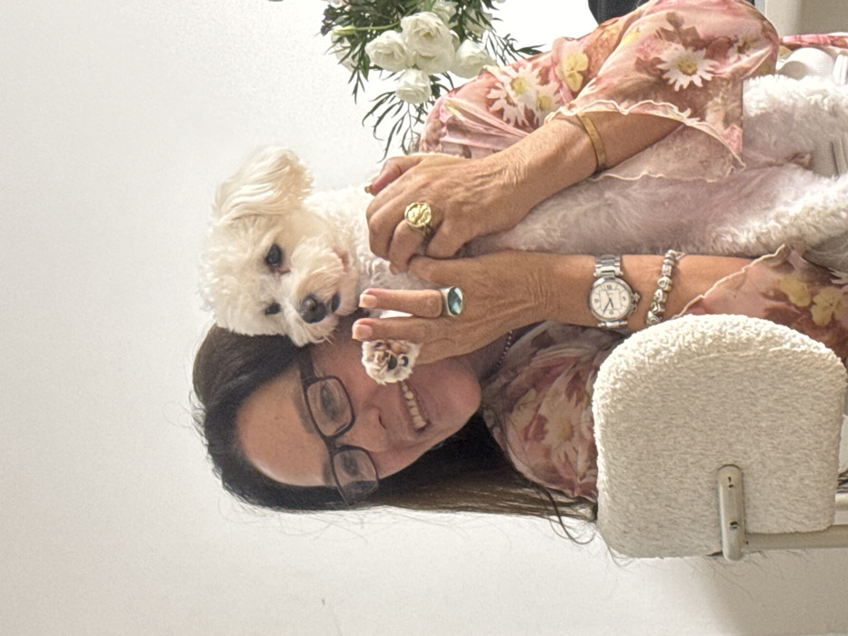 An indoor scene, located in Ramat HaSharon, Israel, displays a smiling woman holding a small white dog. The woman, with long dark hair, wears dark-framed eyeglasses and a light-colored, floral-patterned blouse. Her left wrist is adorned with a silver-toned wristwatch and a beaded bracelet. A large turquoise-colored ring is visible on her left ring finger, and a gold-toned ring with an emblem or initial is on her right ring finger, along with a plain gold-toned bangle on her right wrist. The small, white, fluffy dog is held securely in her arms. The background consists of a plain white wall, a partial view of a light-colored upholstered chair on the left, and a floral arrangement featuring white flowers and green foliage on the right.