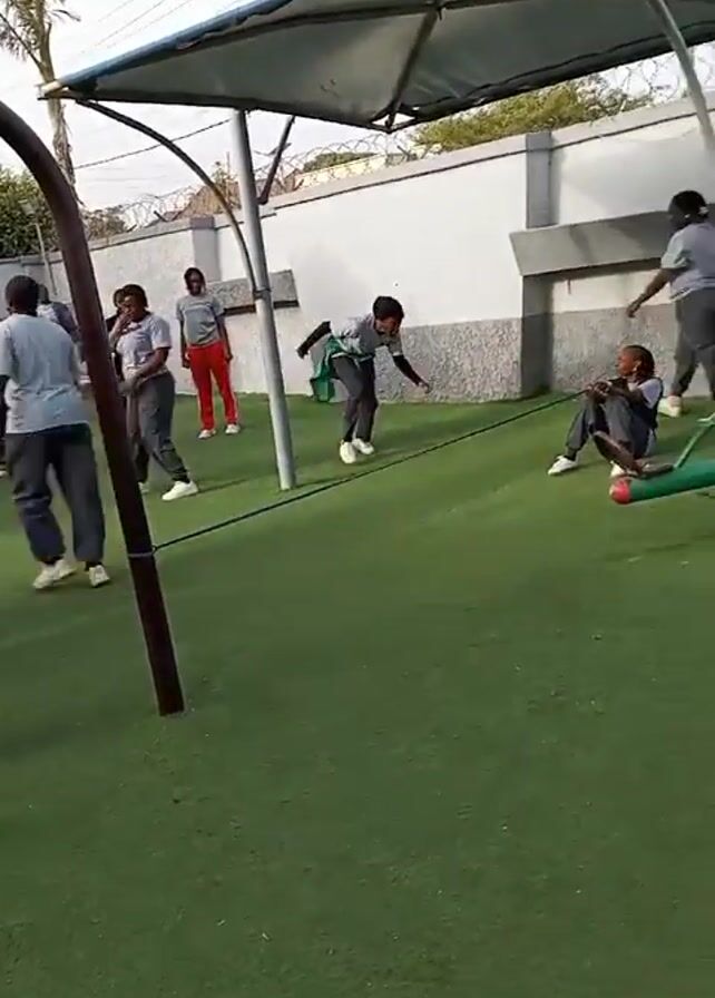 group of people on what appears to be a playground. The ground is covered in green artificial turf. Several people are wearing what seem to be similar gray shirts and pants. One woman in gray is jumping over a horizontal rope strung between two metal poles. Another individual is sitting on a seesaw. There's a canopy structure overhead, supported by metal poles. In the background, there's a white wall, trees and a clear sky. Music is playing in the background.